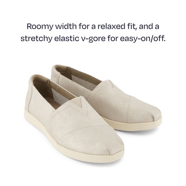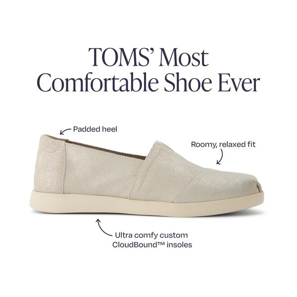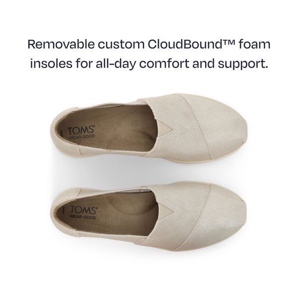 The Alpargata Plus—the most comfortable shoe we’ve ever made, featuring a roomy fit, metallic champagne suede uppers and custom CloudBoundâ„¢ insoles that feel light and airy on your feet. See the world in the shoe designed to leave an impact.Suede uppers. TOMS leather products support responsible manufacturing via the Leather Working Group.