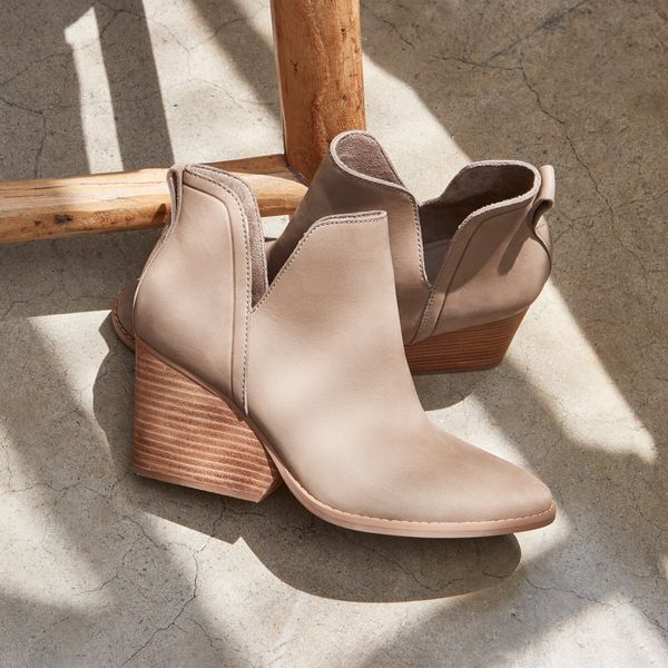 Casual elegance; lasting comfort. Meet the Eliza, a dune-colored Nubuck leather bootie with a sculpted wedge heel and bold cutouts for a touch of edge. Pull tabs and CloudBound™ insoles make them easy to get on and ultra comfortable.Nubuck uppers. TOMS leather products support responsible manufacturing via the Leather Working Group.