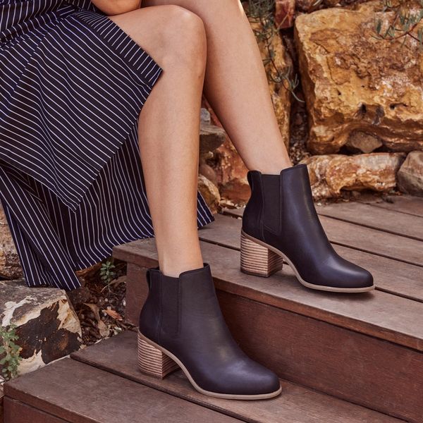 Make a statement and an impact in the Evelyn. This trendy Chelsea ankle boot instantly elevates your look with black leather uppers and a stacked heel. Fitted with CloudBound™ insoles and dual elastic gore for comfort and ease.Leather uppers. TOMS leather products support responsible manufacturing via the Leather Working Group.