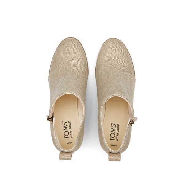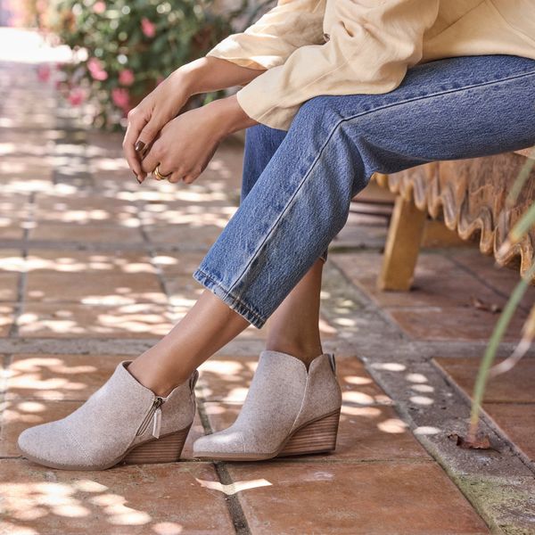 Our Goldie wedge ankle bootie is one you’ll love to wear on repeat. Designed with a just-right heel height, sleek silhouette, and stylish details like the leather-wrapped wedge and shimmer twill upper. They’ll go with almost anything in your closet.Twill textile uppers with shimmer detailing.