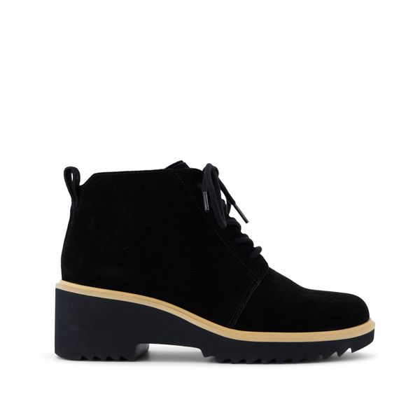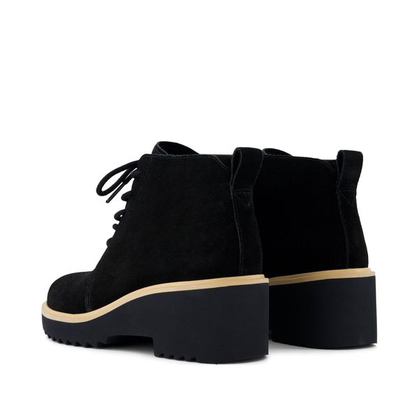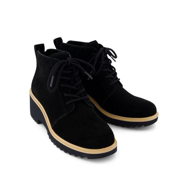 The Maude: a lace-up boot ankle that every wardrobe needs. With a wedge heel and black suede uppers, this sophisticated style is ideal for the office or out dining. CloudBoundâ„¢ insoles provide long-lasting comfort and support.Suede uppers. TOMS leather products support responsible manufacturing via the Leather Working Group.