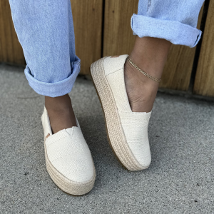 Your favorite platform espadrille, now in linen with metallic stripe details. Featuring a sleek silhouette, chic rope-wrapped detailing, and an improved fit. The Valencia is ready to take you from work to the weekend with comfort and style. Linen textile upper with metallic foil detailing.