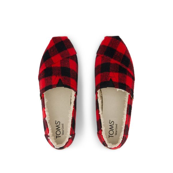 Buffalo Plaid Red Faux Shearling, 10022937TOMS run true to size and are available in medium width only. We recommend ordering the size you normally wear. If you are typically in between sizes, we recommend going with the smaller one since TOMS will stretch slightly as you break them in.