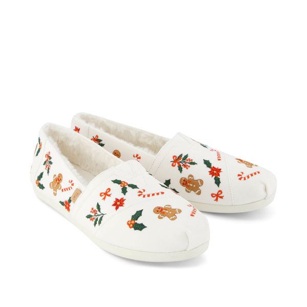 Our holiday-ready Alpargata Classic: A TOMS original closet staple. These slip-on shoes balance festive style and function seamlessly with candy cane, holly and mistletoe embroidery to make spirits bright, plus faux fur linings for the ultimate coziness. CloudBound™ insoles provide superior comfort and support.Velveteen textile upper with festive embroidery.
