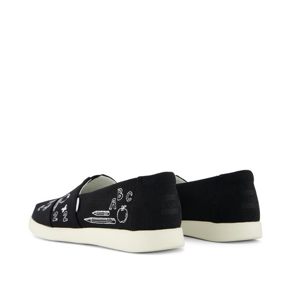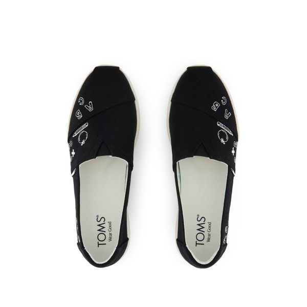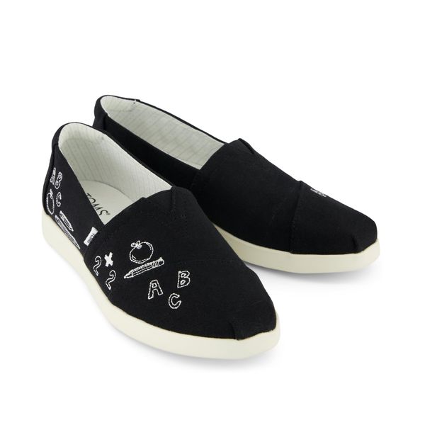 Black Slub Woven Back To School Doodle Embroidery, 10022788TOMS Alpargata Plus has a relaxed fit. We recommend ordering the size you normally wear. If you are used to our slimmer fitting Alpargata Classic, then we recommend sizing down half a size for a more snug fit.