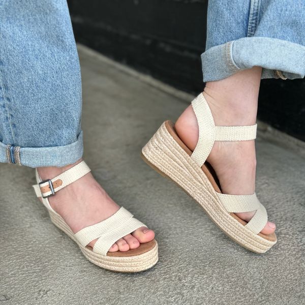 Your elevated sandal staple: our mid-height Audrey wedge linen sandals. Featuring ultra-feminine design details like to-the-floor rope wrap, glimmering metallic pops that go beyond basic beige, and a chic ankle strap buckle. Achieve effortless elegance and look stylish from seaside vacations to outdoor weddings and keep comfortable every step of the way.Linen upper with metallic stripe detailing.