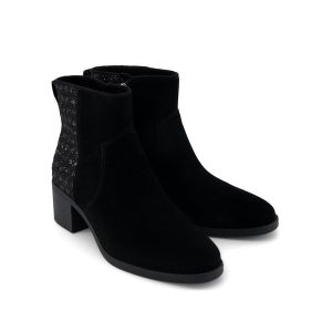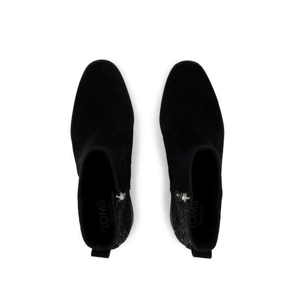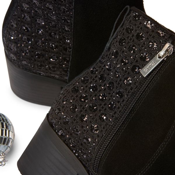 Saddle up with our new western-inspired heeled boot: Delilah. Soft suede uppers, whipstitch collar and seam line details, and a pop of geometric sequins bring glam to the ranch-ready look. Dress up any casual city or country ‘fit. Suede upper with geometric sequin detailing. TOMS leather products support responsible manufacturing via the Leather Working Group.