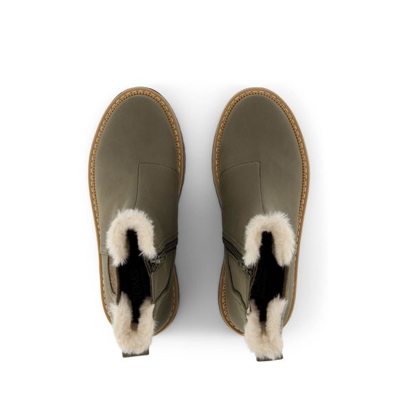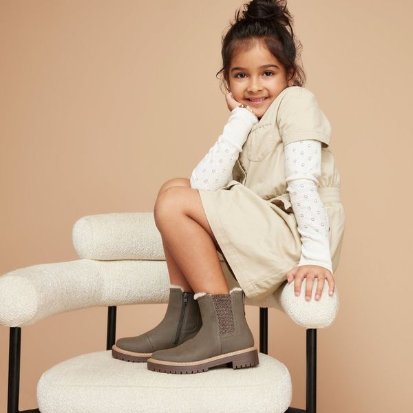 The Bennet: a must-have, easy-on Chelsea ankle boot for little ones, made with sturdy canteen-gray Nubuck leather uppers, cushy insoles and cozy faux-fur lining. It’s also available in adult sizes so Mom or Dad can match.Nubuck leather and faux-fur uppers. TOMS leather products support responsible manufacturing via the Leather Working Group.